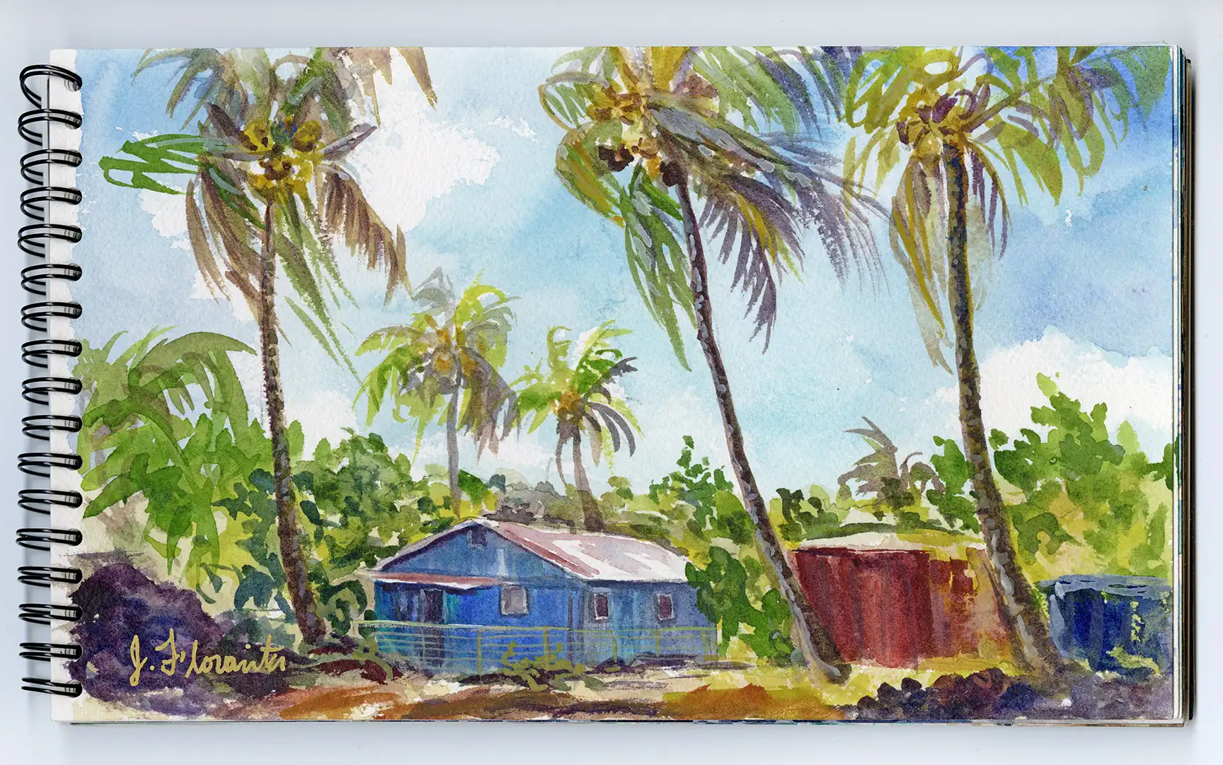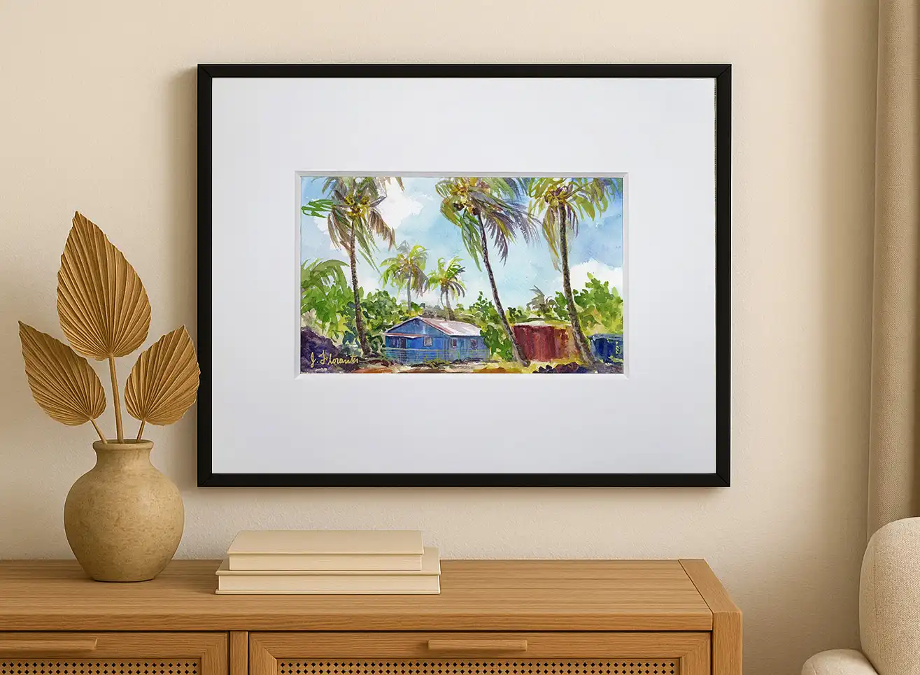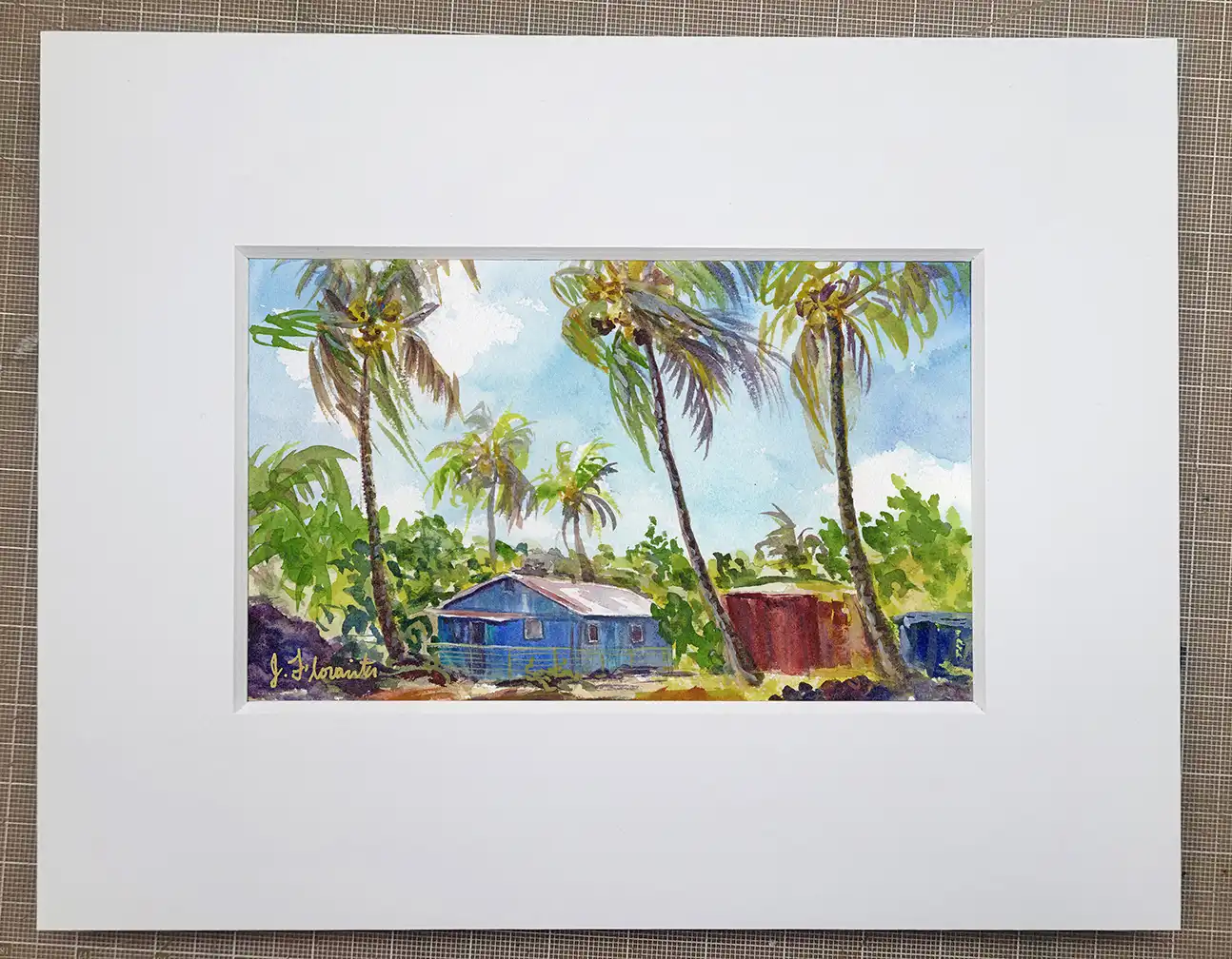 Immerse yourself in island serenity with Blue Island House, an expressive original watercolor featuring windswept coconut palms and a sunlit, rustic blue island home. This vibrant tropical scene captures the essence of a warm breeze dancing through palms under radiant skies—an invitation to slow down and dream.