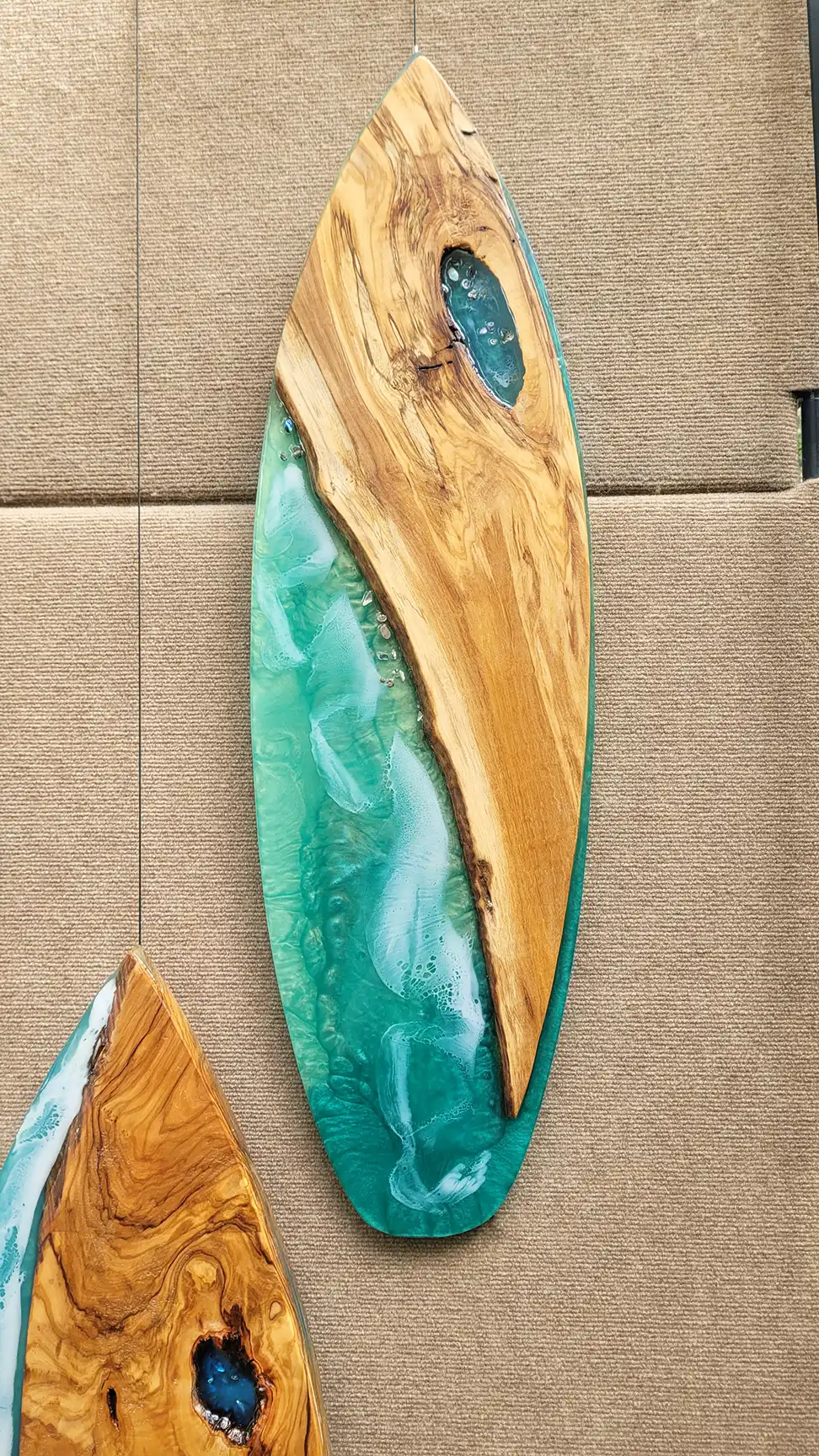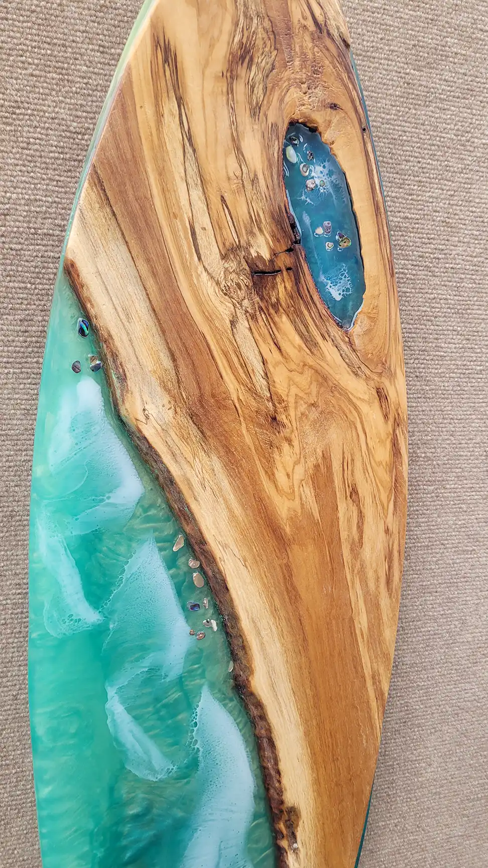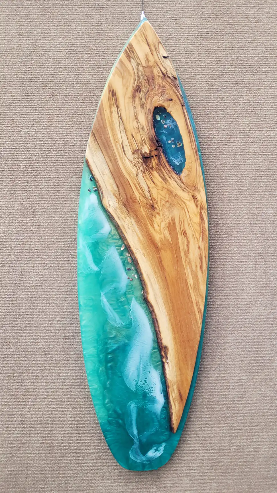 Bring the spirit of the ocean into your space with Jenny Floravita’s exquisite Live Edge Olive Wood Fine Art Surfboards. Inspired by the beauty of the sea and the organic grace of nature, this 36-inch tall sculptural piece is a stunning fusion of natural olive wood and hand-poured cast epoxy.