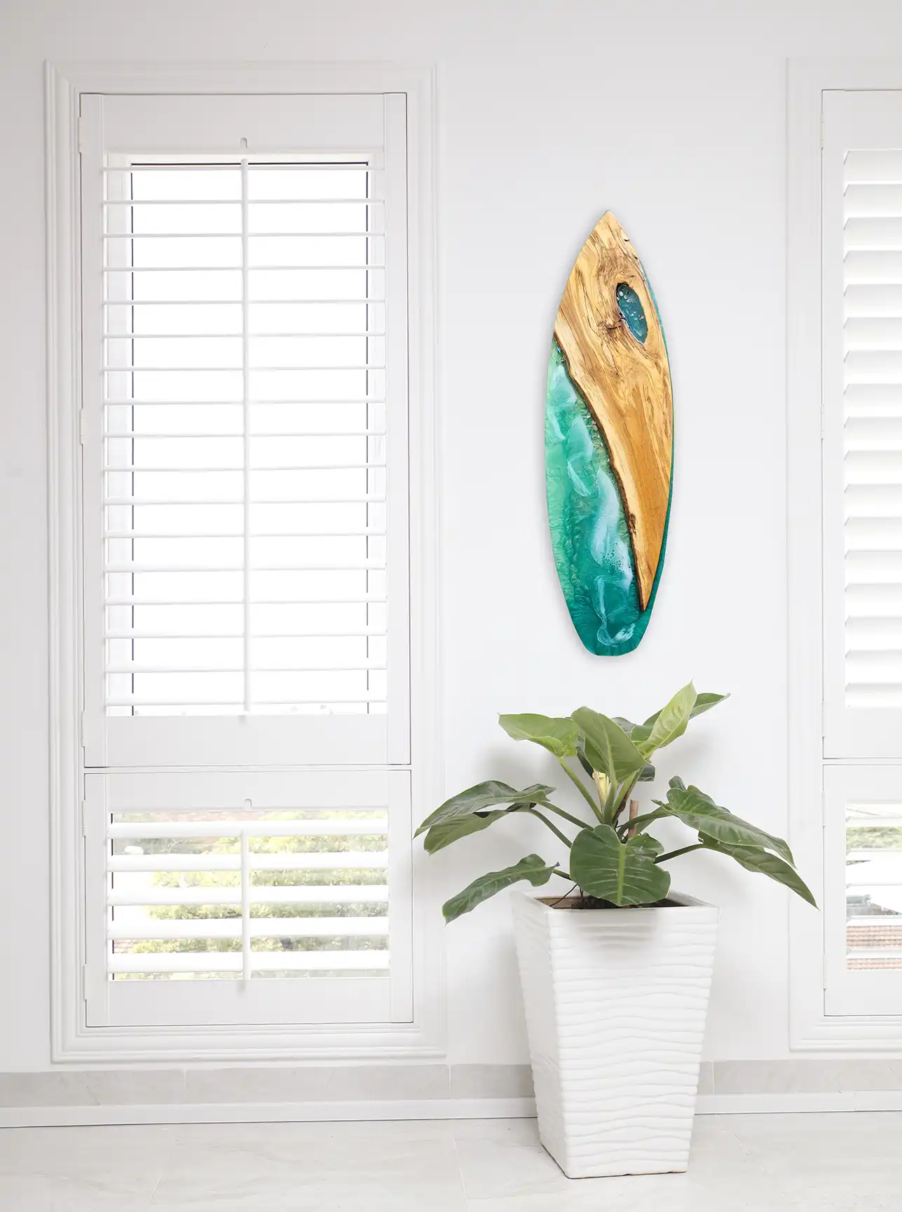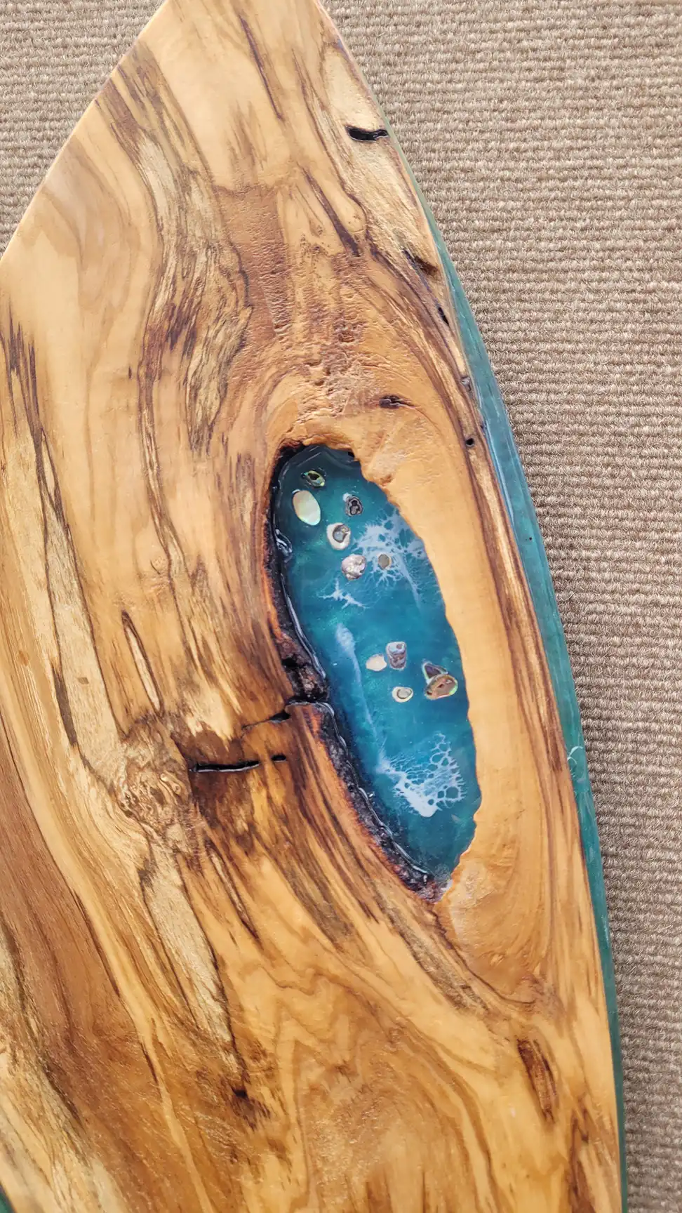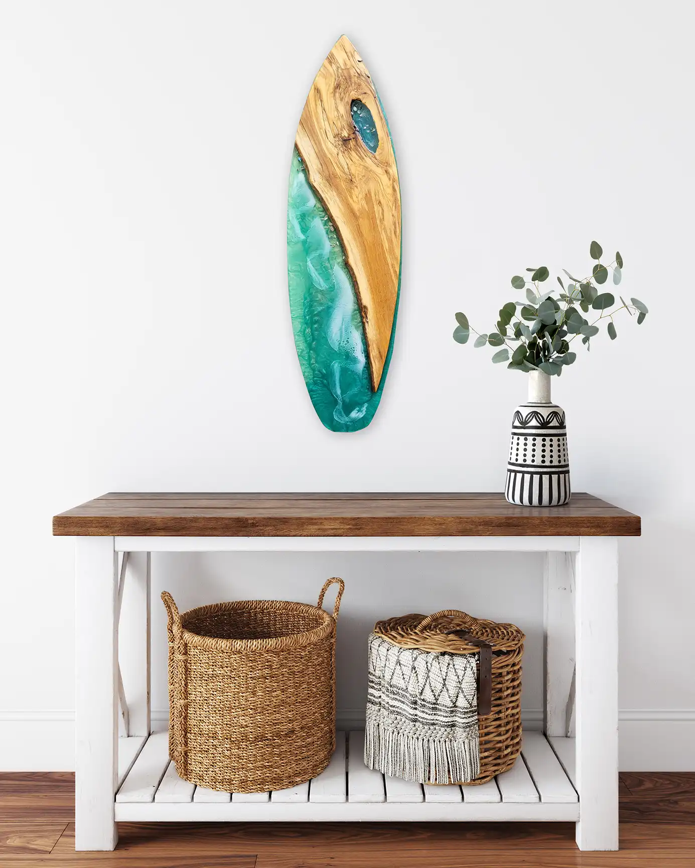 Bring the spirit of the ocean into your space with Jenny Floravita’s exquisite Live Edge Olive Wood Fine Art Surfboards. Inspired by the beauty of the sea and the organic grace of nature, this 36-inch tall sculptural piece is a stunning fusion of natural olive wood and hand-poured cast epoxy.