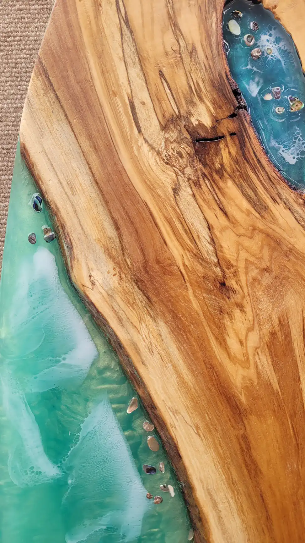 Every board begins with the careful selection of live edge olive wood—chosen for its rich grain patterns and flowing curves. As the wood is cut and shaped, it reveals forms reminiscent of abstract coastlines, telling a story of land and sea.