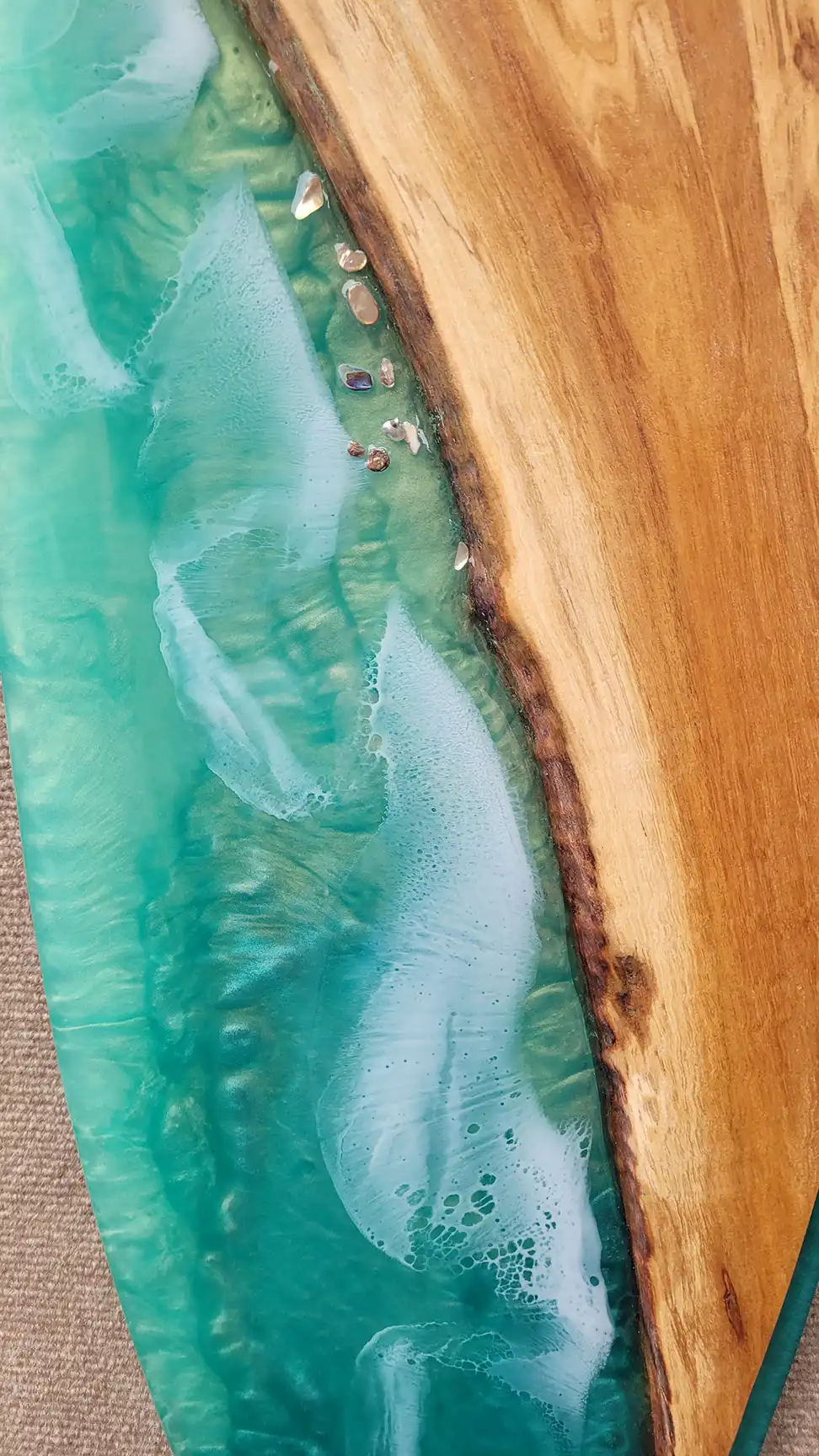 Epoxy is artfully cast in layers to evoke the endless moods of ocean water—from misty blues and tranquil tides to bold, crashing waves—making each piece an emotional seascape.