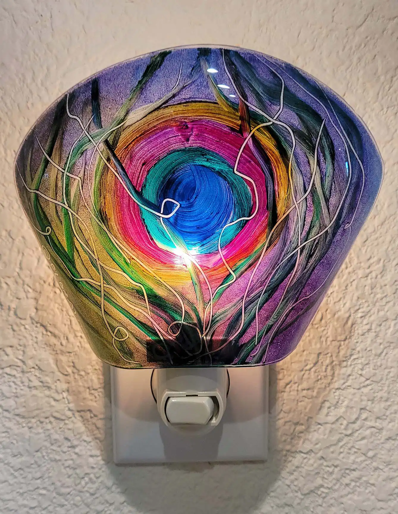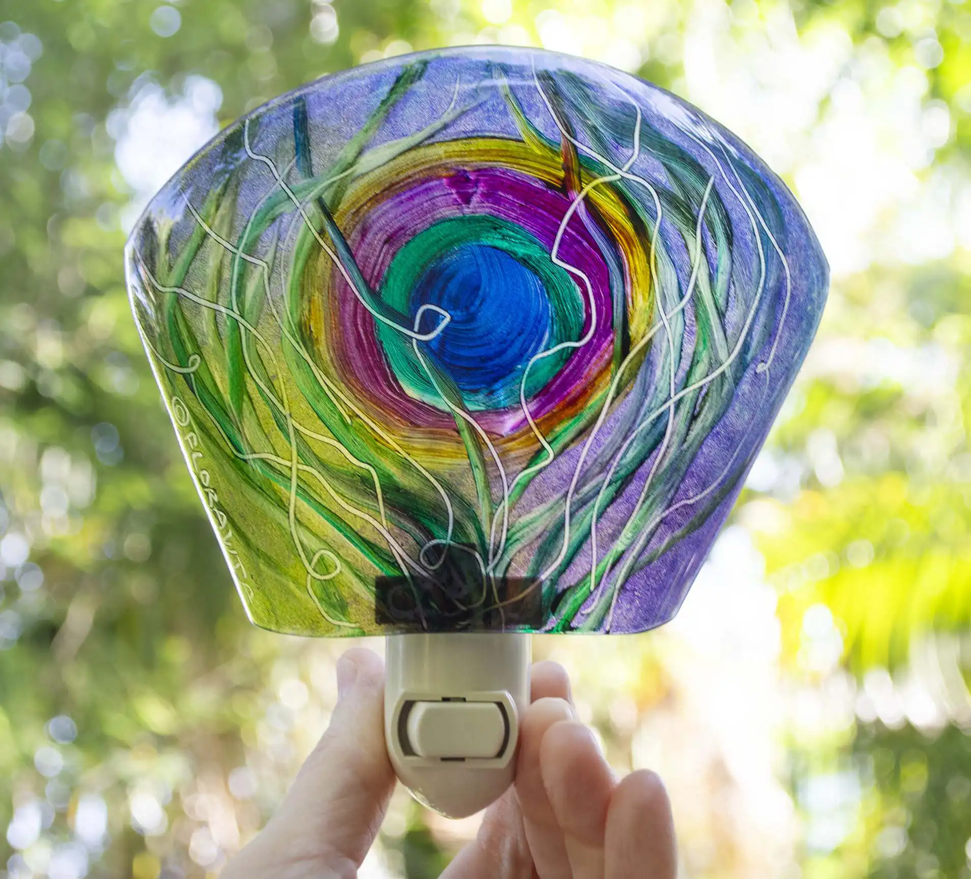 This exotic Peacock Feather night light is very soothing. Beautiful in bathrooms or bedrooms. Has a gorgeous warm glow. This hand crafted painted glass night light is painted with great expression. What a great way to rekindle the memory of a tropical escape or give as a unique gift to a valued friend. Peacock feature expressions will vary slightly as they are all painted freely. Each night light is hand cut and kiln formed glass. Painted and signed by artist Jenny Floravita.