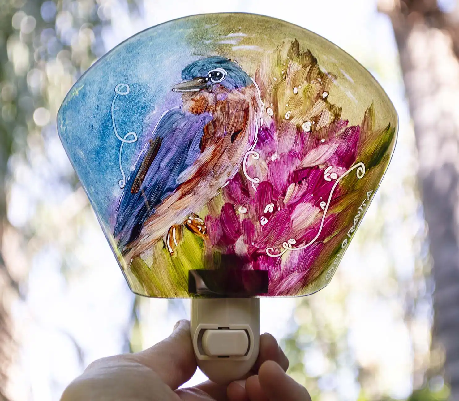 Beautifully crafted Pink Lupine Songbird nightlight is a reversed painted work of art on glass. A lovely soft glow will illuminate the room from this functional and affordable work of art. Makes a wonderful unique gift for moms. Lovely in guest rooms and bedrooms. Each of these beauties has it’s own expression and subtle color hues but all light up beautifully. Each night light is hand cut and kiln formed glass. Painted and signed by artist Jenny Floravita.