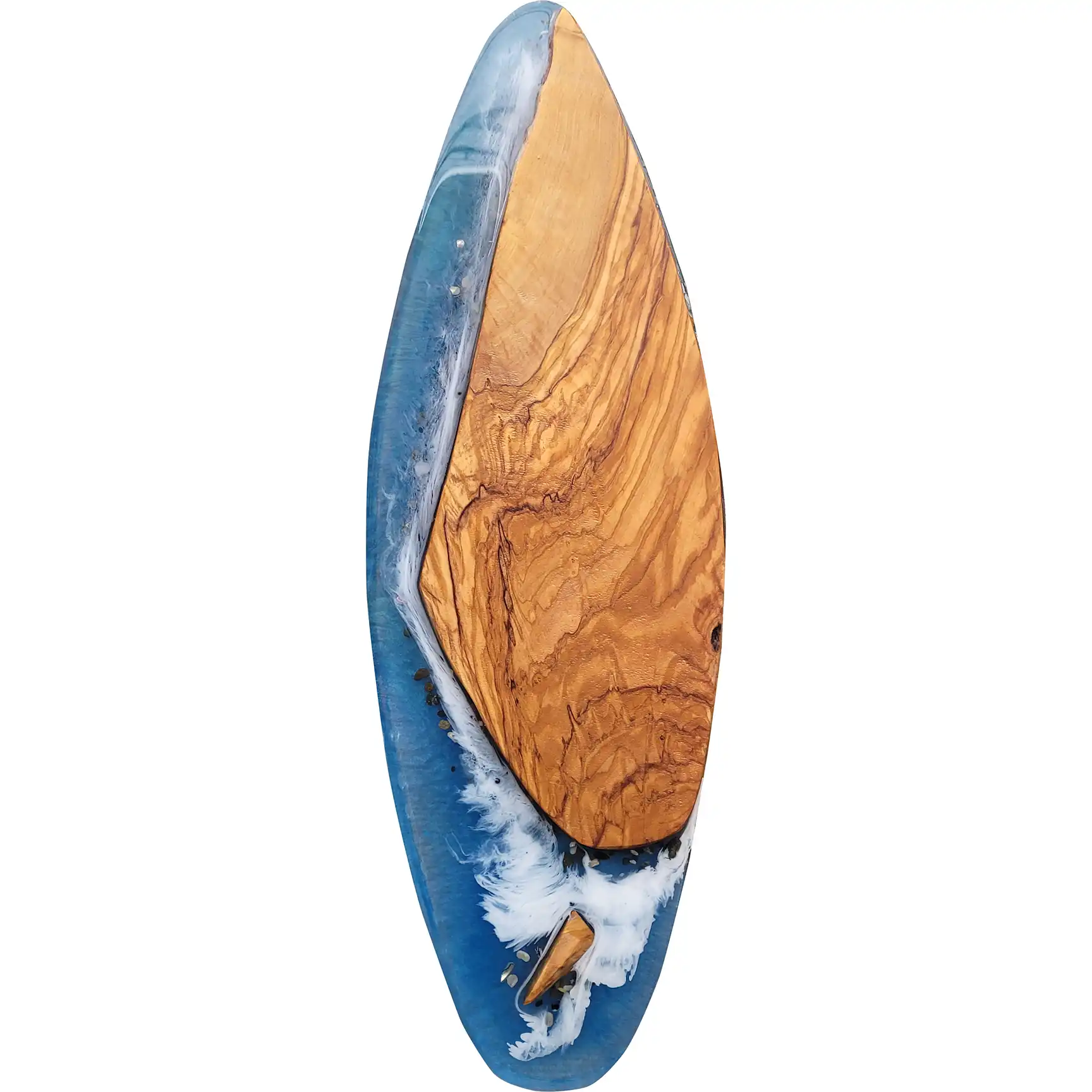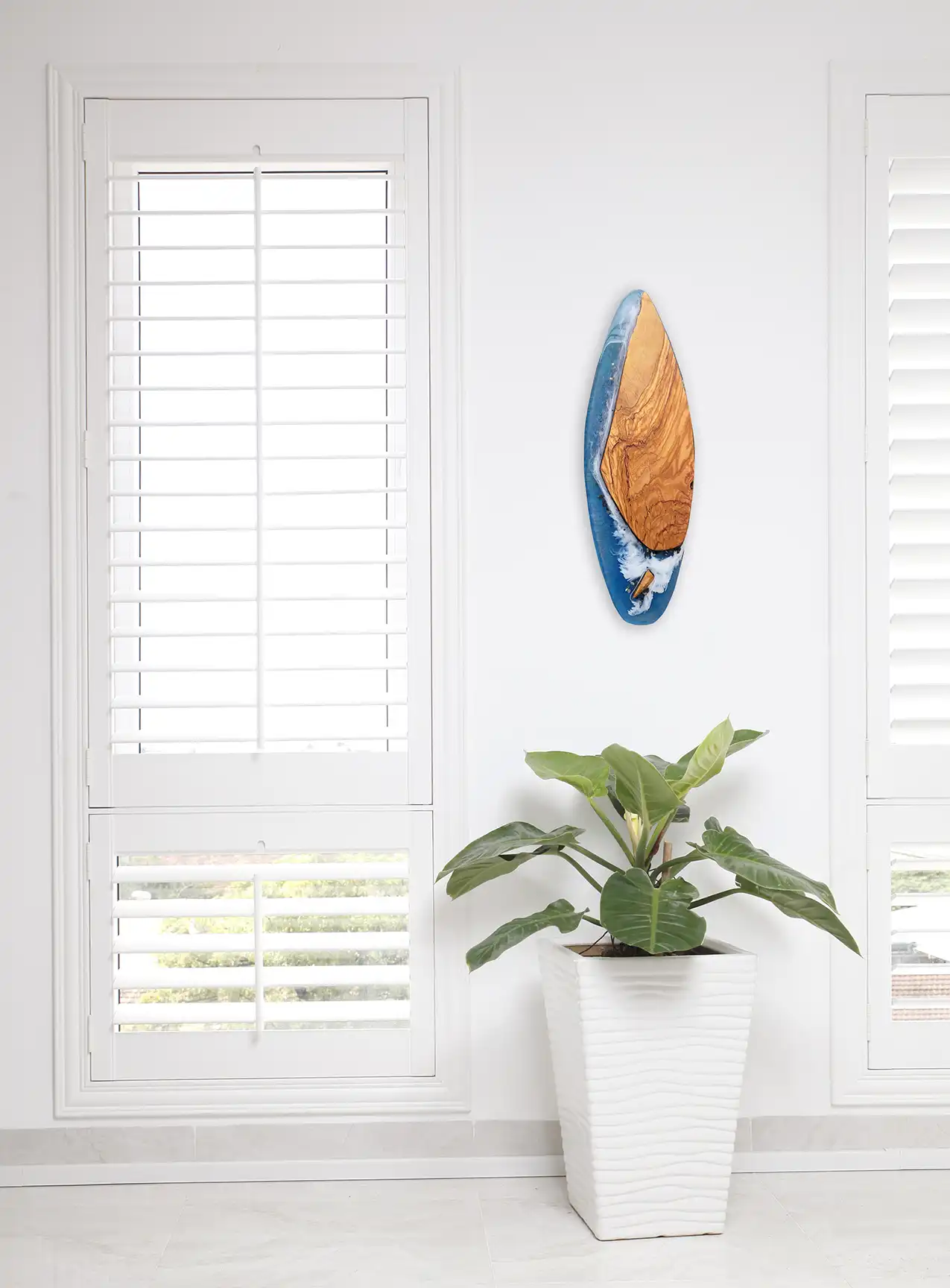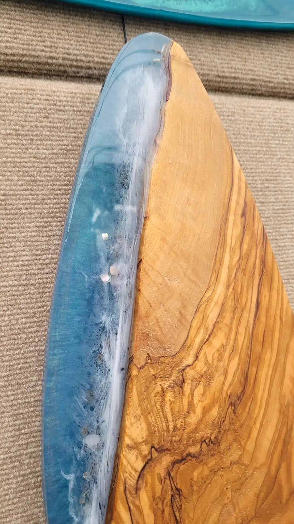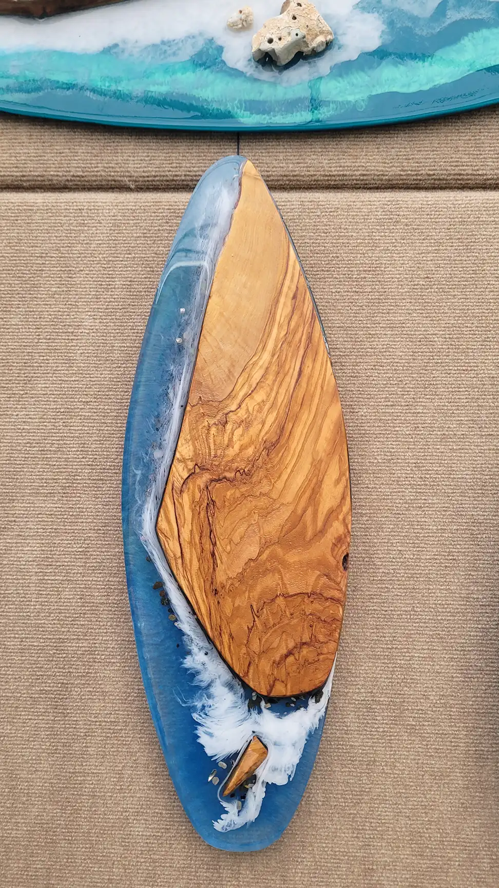 Bring the spirit of the ocean into your space with Jenny Floravita’s exquisite Live Edge Olive Wood Fine Art Surfboards. Inspired by the beauty of the sea and the organic grace of nature, this 24-inch tall sculptural piece is a stunning fusion of natural olive wood and hand-poured cast epoxy.