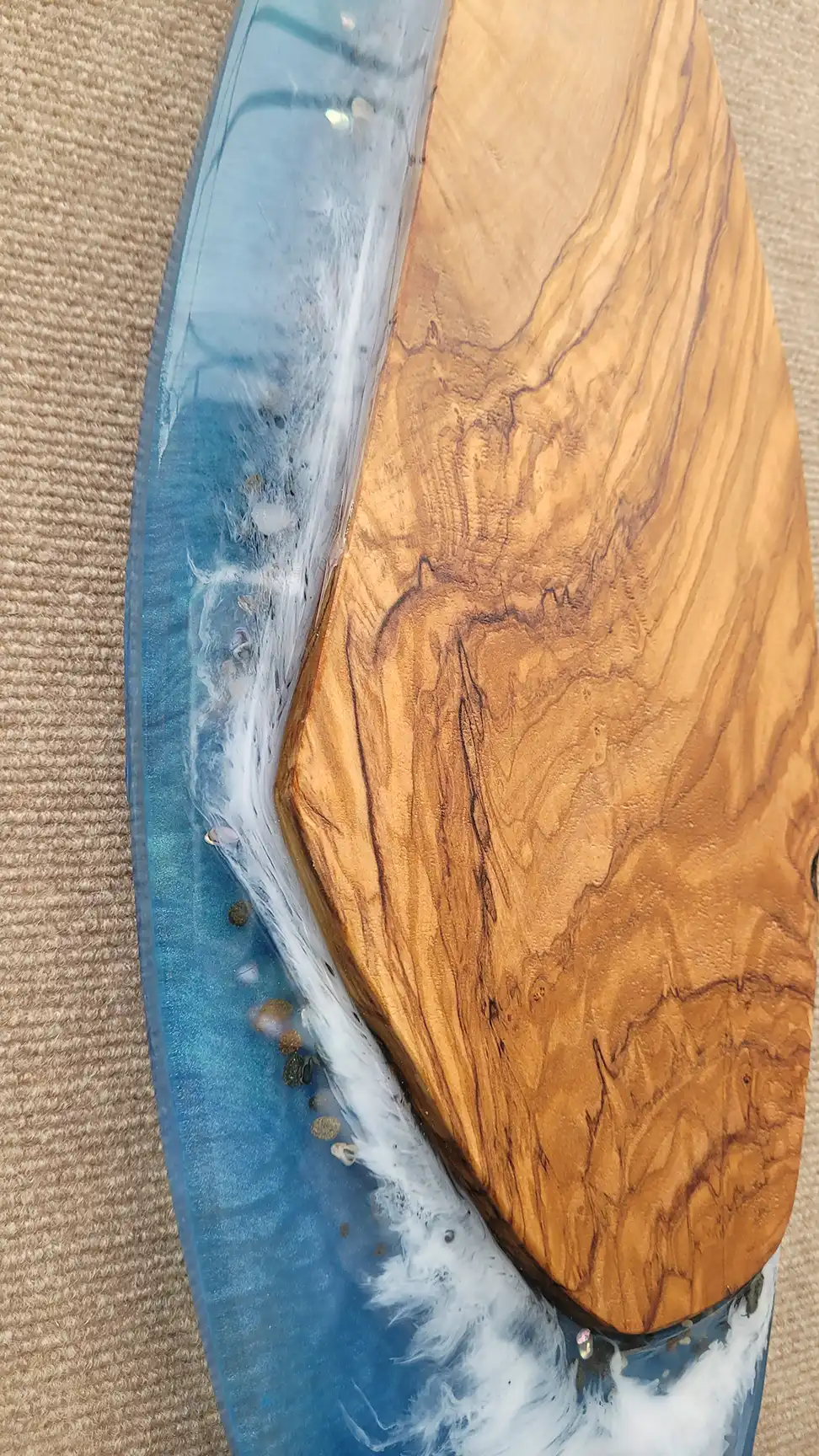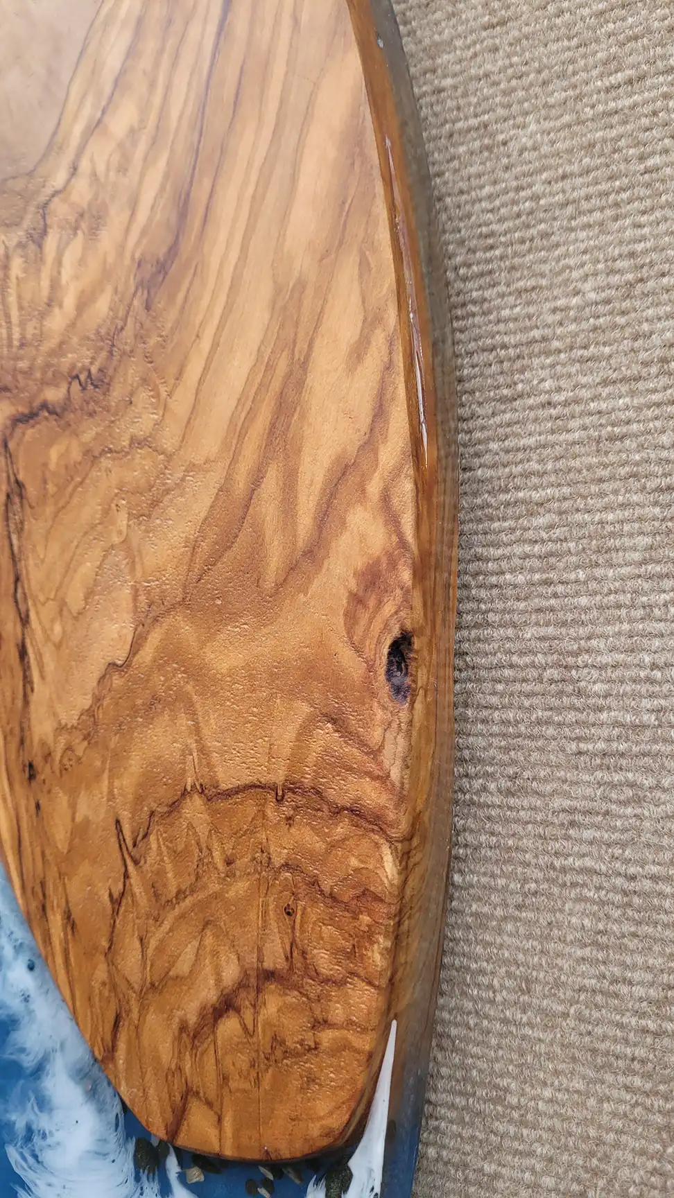 Every board begins with the careful selection of live edge olive wood—chosen for its rich grain patterns and flowing curves. As the wood is cut and shaped, it reveals forms reminiscent of abstract coastlines, telling a story of land and sea.