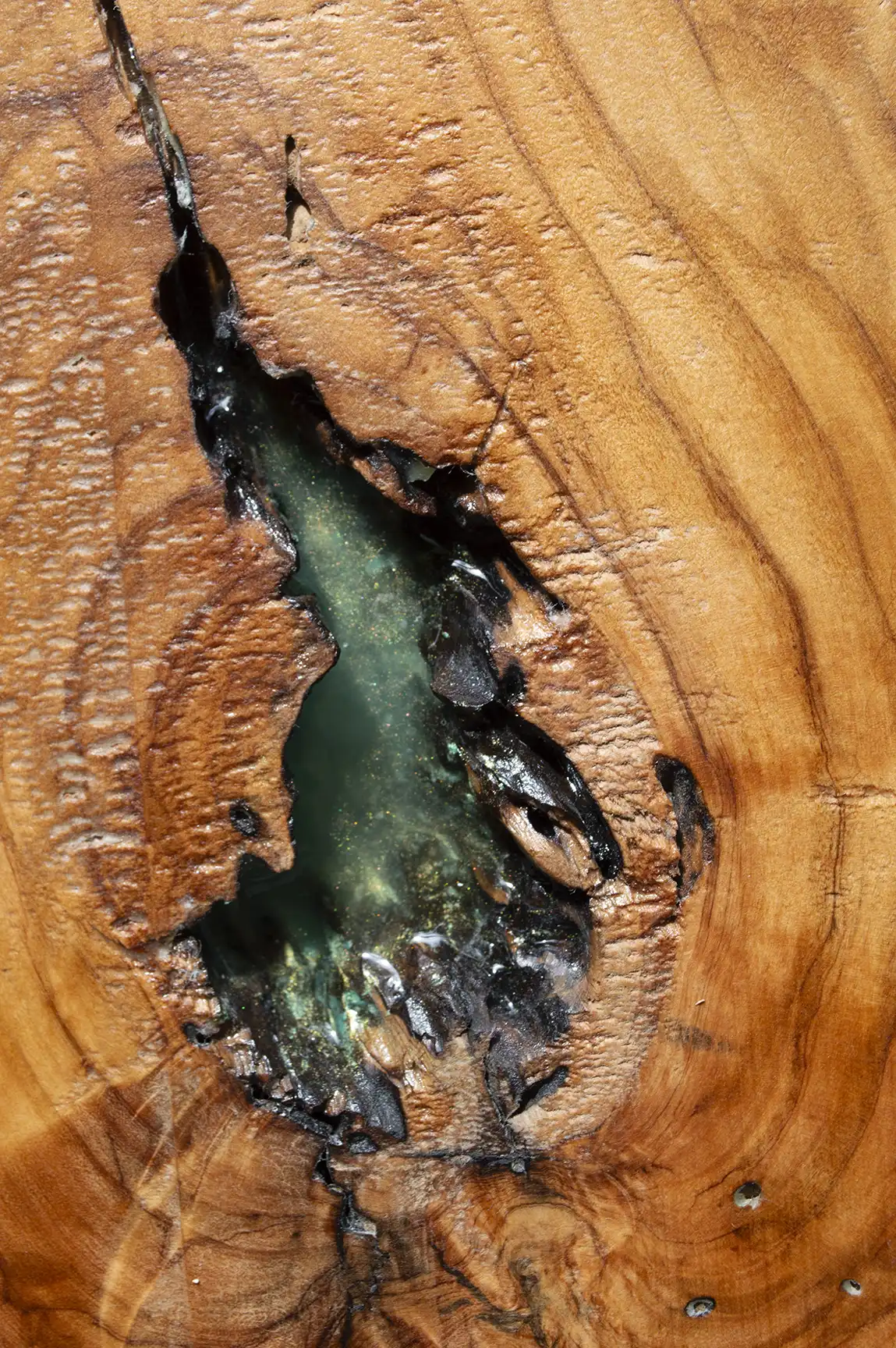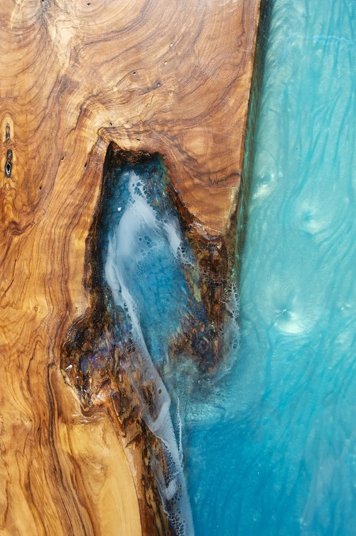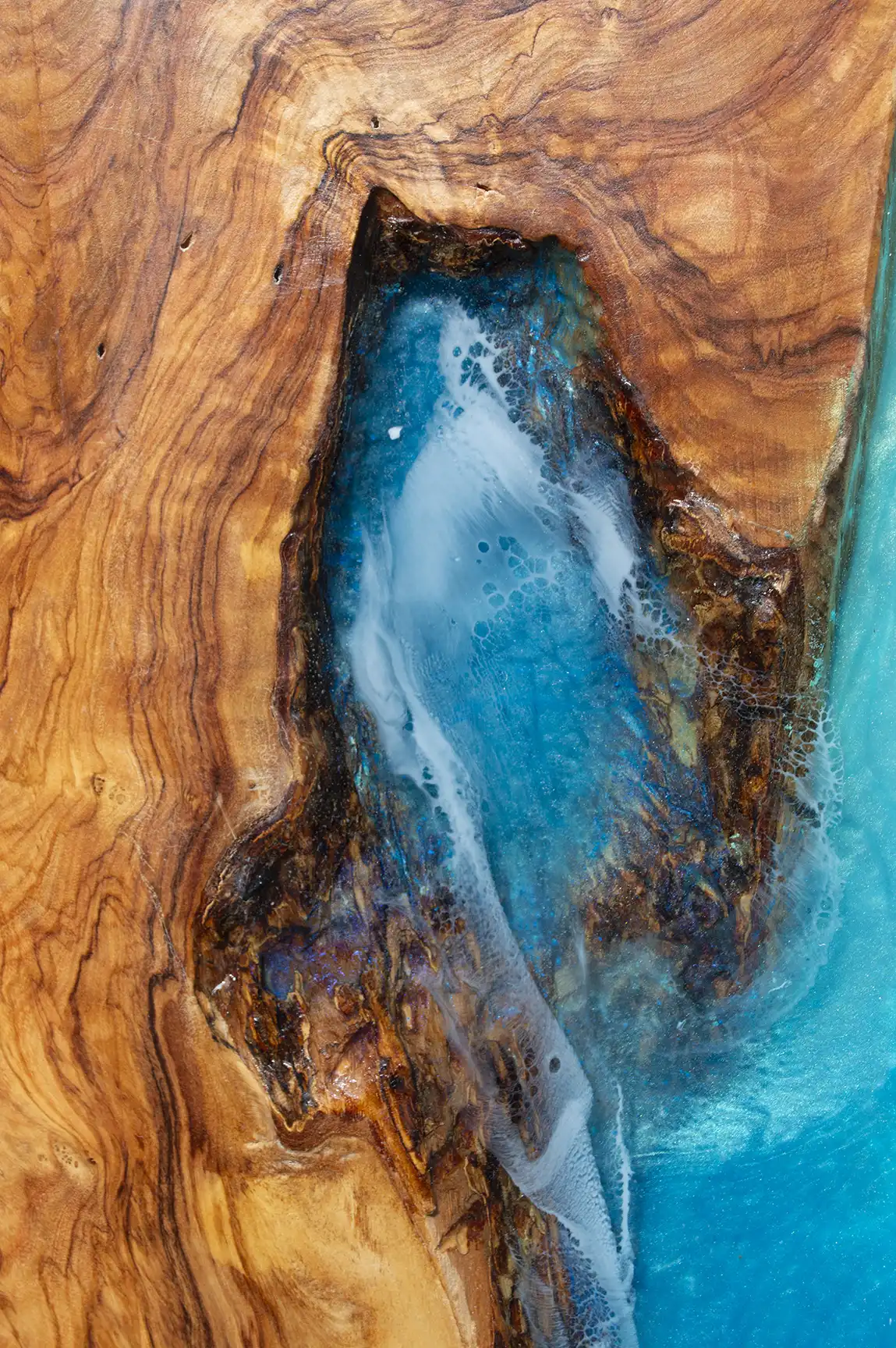 Every board begins with the careful selection of live edge olive wood—chosen for its rich grain patterns and flowing curves. As the wood is cut and shaped, it reveals forms reminiscent of abstract coastlines, telling a story of land and sea.