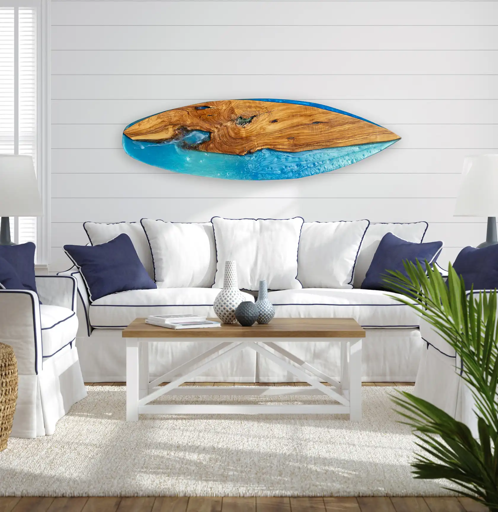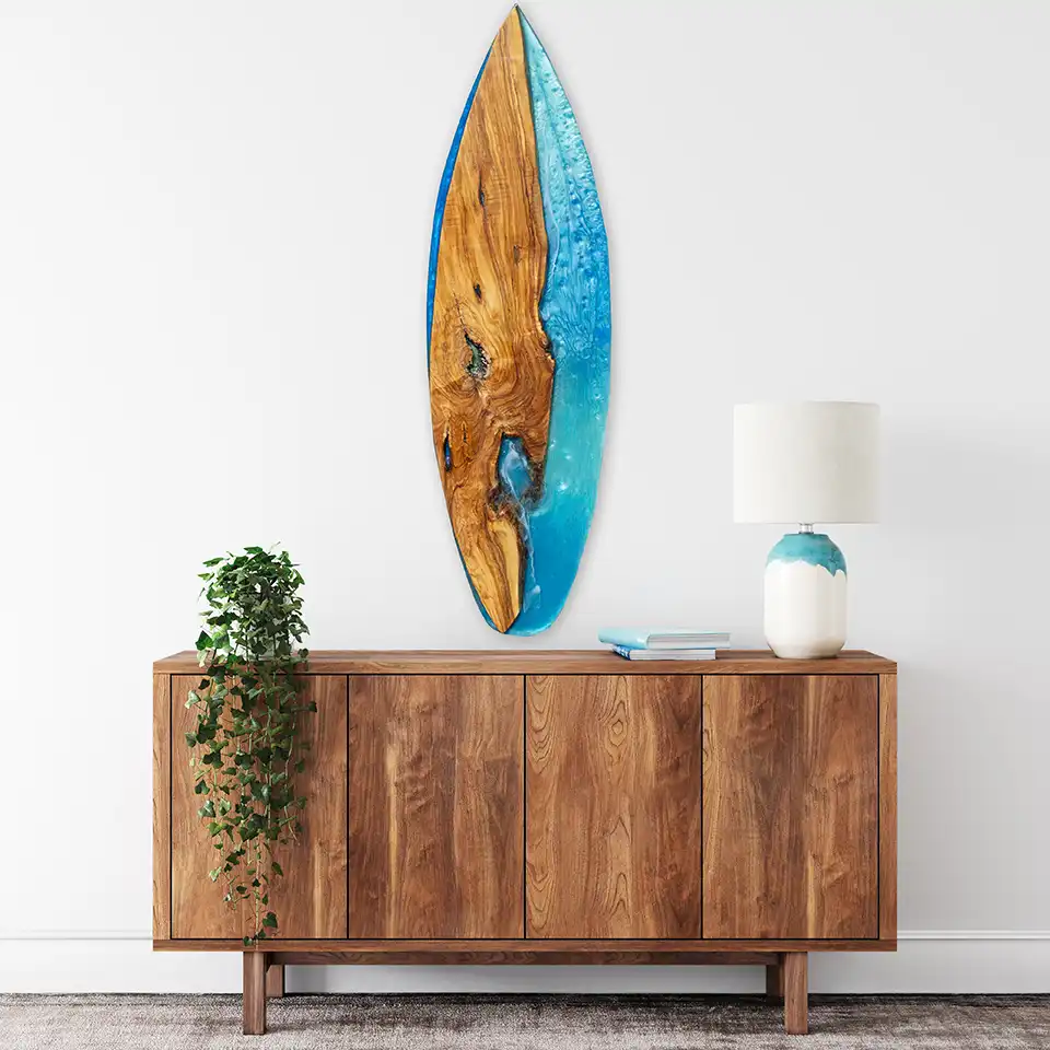 Epoxy is artfully cast in layers to evoke the endless moods of ocean water—from misty blues and tranquil tides to bold, crashing waves—making each piece an emotional seascape.