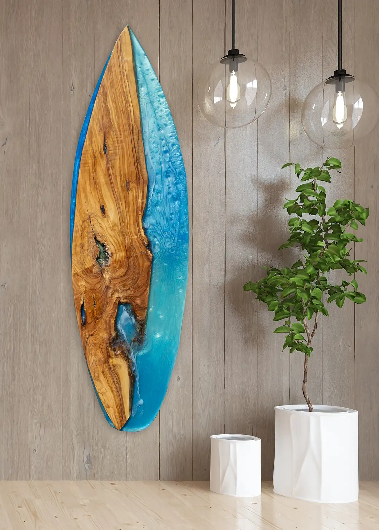 Bring the spirit of the ocean into your space with Jenny Floravita’s exquisite Live Edge Olive Wood Fine Art Surfboards. Inspired by the beauty of the sea and the organic grace of nature, this 36-inch tall sculptural piece is a stunning fusion of natural olive wood and hand-poured cast epoxy.